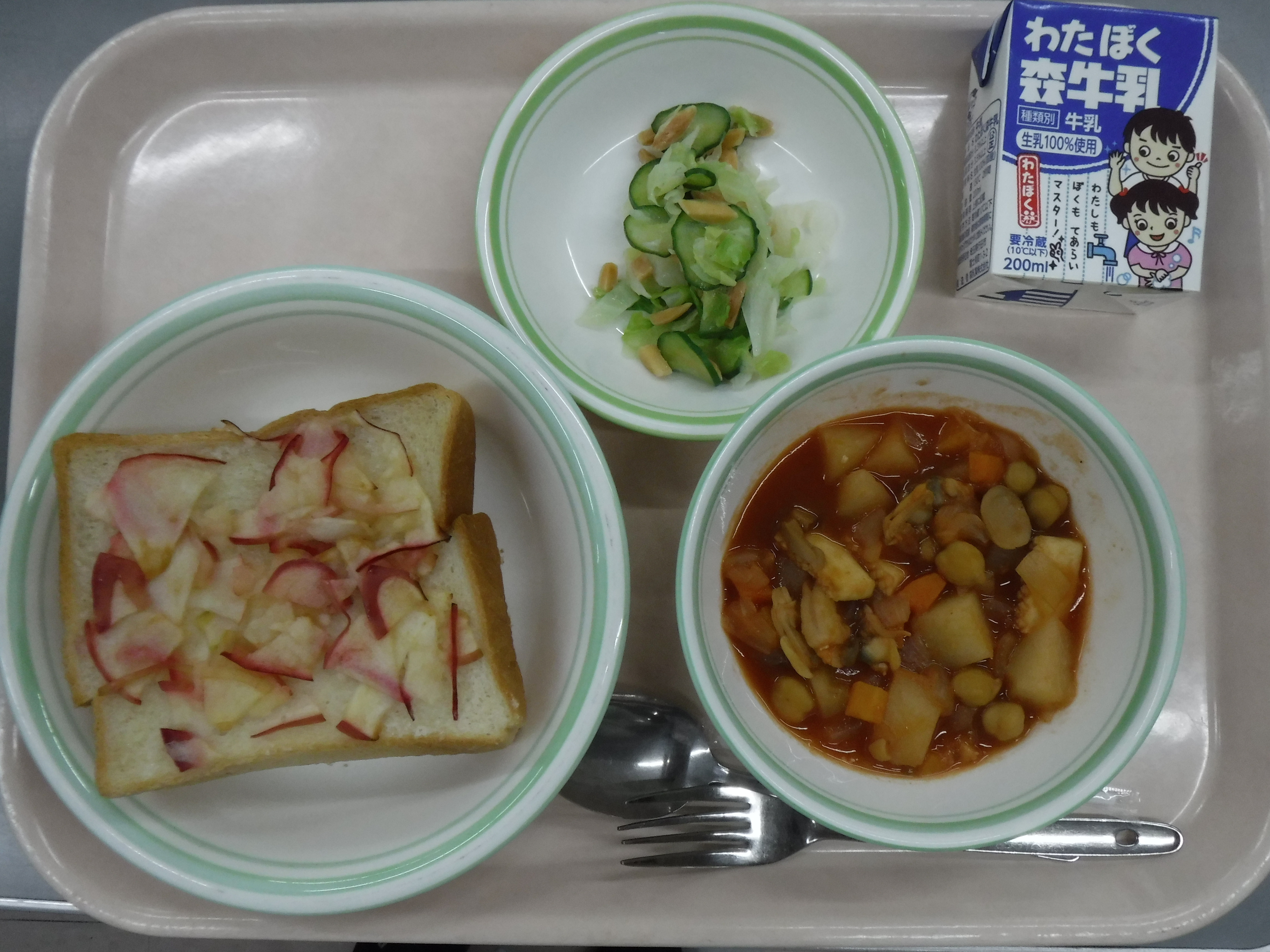 ・アップルトースト ・牛乳 ・豆とシーフードのトマト煮 ・アーモンドサラダ