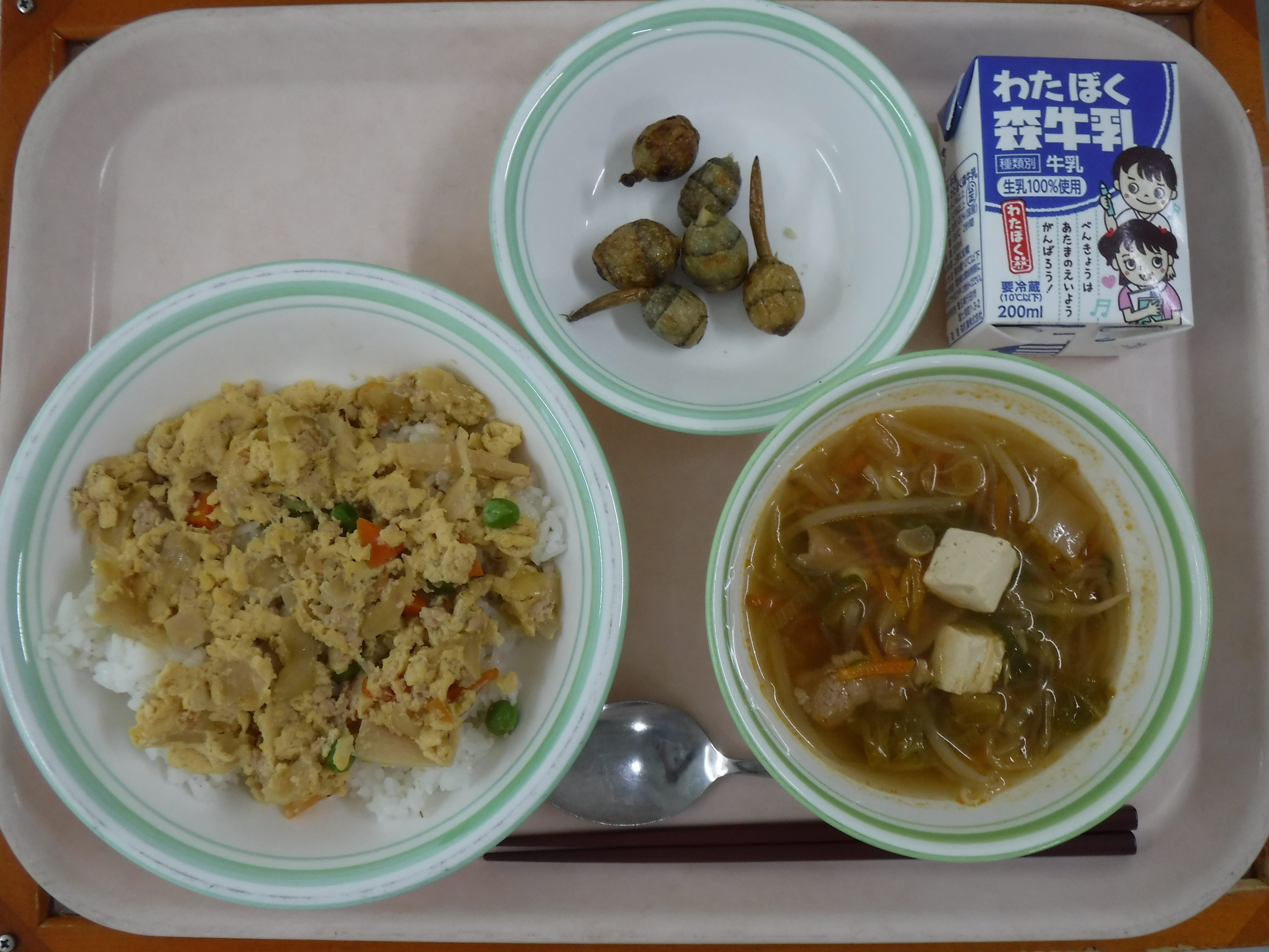 ・玉子丼(麦ごはん) ・牛乳 ・くわいの唐揚げ ・キムチスープ