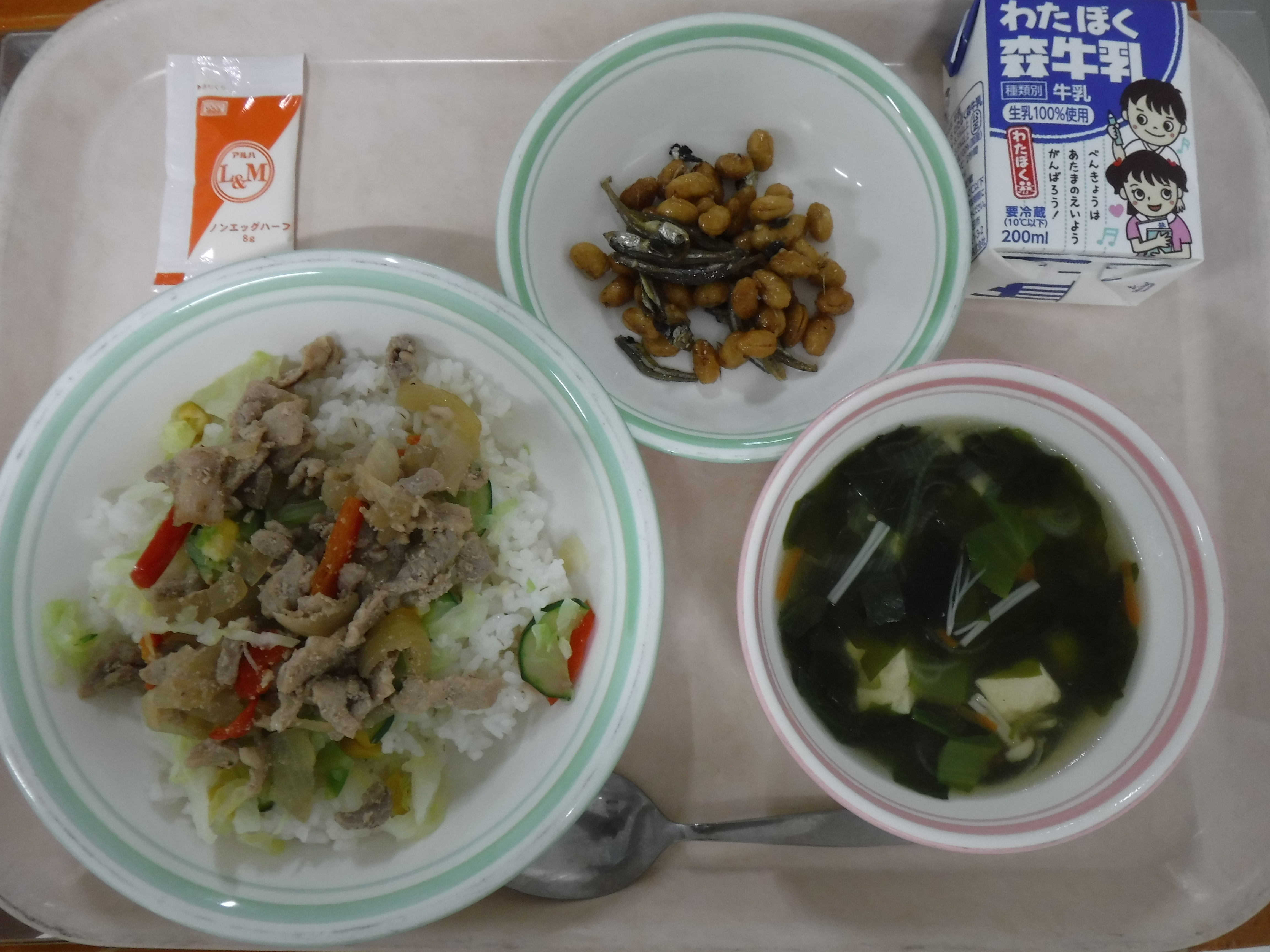・シシリアンライス(麦ごはん) ・牛乳 ・大豆と小魚の甘辛揚げ ・わかめスープ